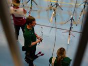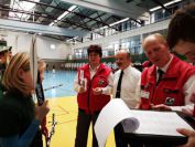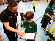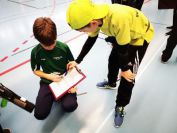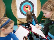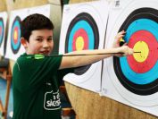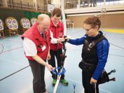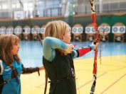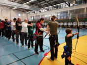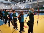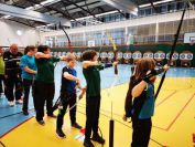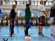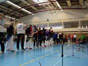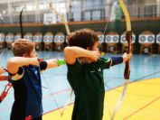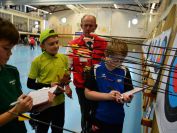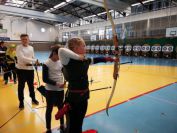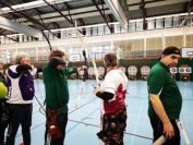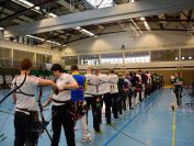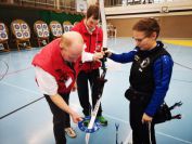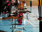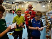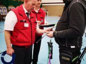 Gestärkt startete nun der zweite Wettkampf der Landesmeisterschaften. Nach der gemeinsamen Erwärmung aus Lockerungs- und Dehnübungen der Schützen mit dem Trainerteam, galt es sich der Bogenkontrolle zu unterziehen. Bevor jeder Schütze starten darf, wurde das Bogenequipment von einem Kamprichterkomitee entsprechend begutachtet: Pfeile sollten beschriftet sein, am Fingerschutz – Tab darf keine Markierung gekennzeichnet sein und selbst am Bogen darf der Zielpin beim Recurvebogen nicht über ein bestimmtes Maß herausragen. Beim traditionellen Bogen sind Hilfsmittel nicht erlaubt. Geschafft, der Bogen bekommt eine Marke und ist somit für den Wettkampf zugelassen. Nun konnten sich die Döbelner Bogenschützen voll und ganz auf den Wettkampf konzentrieren. „Jetzt schießt unser Nachwuchs, worauf wir sehr stolz sind. In der heimischen Gegend ist die Aufregung vielleicht nicht ganz so groß“, erzählt Vereinsvorsitzender Thomas Eichhorn. Konzentriert traten die Schützen an die Schießlinie, um auch wie die Vormittagsgruppe auf eine Distanz von 18 Metern auf ihre entsprechende Auflagengröße zu schießen.