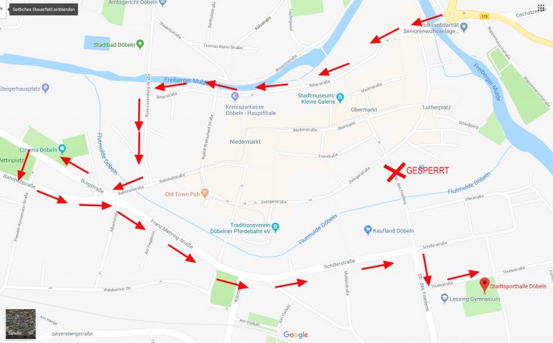 Nehmt im Kreisel über die Oberbrücke die Ritterstraße und folgt den Umleitungsschildern durch die Stadt.