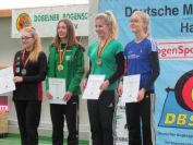 Am Nachmittag durften dann die Damen und die „etwas älteren Damen“ zeigen, was sie können. In der Altersklasse Damen Recurve gingen die beiden Döbelnerinnen Anne Eichhorn und Yvette Gieseke an den Start. Für beide verlief der Wettkampf nicht ganz so wie erhofft und mussten die vorderen Platzierungen abgeben. Mit einem Gesamtergebnis von 518 Ringen wurde Yvette Achte und Anne landete mit 504 Ringen auf Platz 11. Bei Silke Bertram, die in der Altersklasse Damen Ü40 Recurve teilnahm, lief es von Anfang an sehr gut, sodass sie mit 271 Ringen nach der ersten Runde und weiteren 266 Ringen ihren zweiten Platz für sich behaupten und eine weitere Medaille für die Döbelner erringen konnte. Auch Carola Heinze war am Sonntagnachmittag wieder mit von der Partie und ging in der Altersklasse Damen Ü50 Recurve an den Start. Mit jeweils 249 Ringen und einem Gesamtergebnis von 498 Ringen wurde sie Neunte.