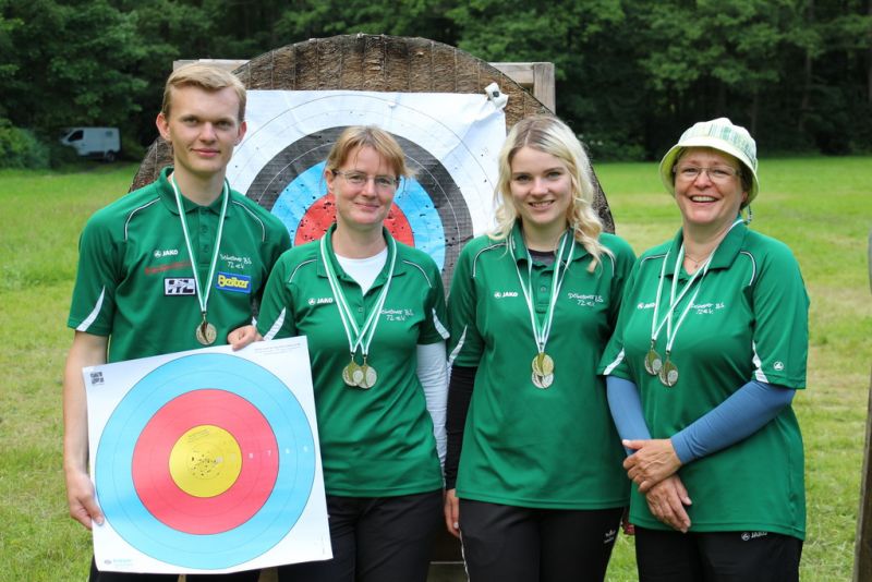 Weiter ging es am Sonntag, den 19.06.2016, für die Erwachsenen im sächsischen Radeberg. Die drei Schützinnen Carola Heinze (Damen Ü-50 Recurve), Silke Bertram (Damen Ü-40 Recurve) und Yvette Gieseke (Damen Recurve) traten neben der Einzelwertung auch als Damen-Mannschaft an. Carola sicherte sich mit ihrem Gesamtergebnis von 1136 Ringen über die vier Entfernungen 60, 50, 40 und 30 Meter einen souveränen zweiten Platz. Kämpferisch ging es bei Silke zu. Sie duellierte sich mit der Leipzigerin Bettina Schmidt auf 70 Metern und hatte mit einem hauchdünnen Vorsprung von einem Ring die Nase zunächst vorn. Auf den weiteren Distanzen 60, 50 und 30 Meter musste sie insgesamt zehn Ringe abgeben, sodass sie am Ende mit einer Ringzahl von 1185 Vizemeisterin wurde. Für Yvette ging es in der Damenklasse konkurrenzmäßig eher ruhiger zu. Als Einzelstarterin konnte sie mit einem Gesamtergebnis von 1143 Ringen über die gleichen vier Distanzen die Goldmedaille entgegennehmen. In der Mannschaftswertung konnten sich die drei Damen gegen sieben weitere Mannschaften durchsetzten und wurden mit 3462 Ringen hinter den Leipziger Schützen mit einer weiteren Silbermedaille belohnt.