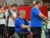 Samstagmorgen gingen für die Döbelner als erste Starter Carola Heinze und Frank Eggert in den Klassen Damen Ü50 Jagdbogen und Herren Ü45 Jagdbogen in das Rennen ums Edelmetall. Während Frank seinen neunten Platz nach der ersten Runde mit 240 Ringen und nochmaligen 235 Ringen in der zweiten Runde konstant verteidigte, musste Carola einen kleinen Rückschlag hinnehmen. Sie rangierte mit 215 Ringen zunächst auf Platz 3, konnte diesen aber mit weiteren 199 Ringen leider nicht halten, sodass sie am Ende mit insgesamt 414 Ringen auf Platz 5 landete. Am Morgen noch als Vereinsvorsitzender die Begrüßungsrede gehalten, trat auch Thomas Eichhorn persönlich dann am Nachmittag in der Kategorie Herren Ü55 Blankbogen an die Schützenlinie. Mit einem Gesamtergebnis von 430 Ringen belegte er ebenfalls einen neunten Platz.