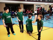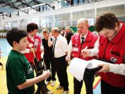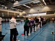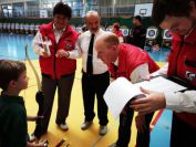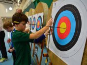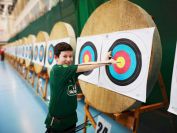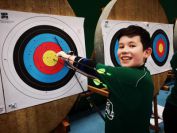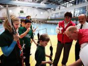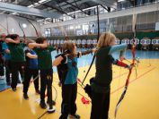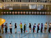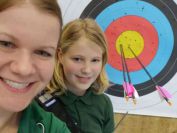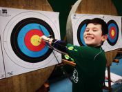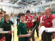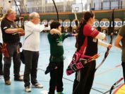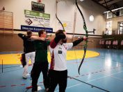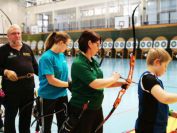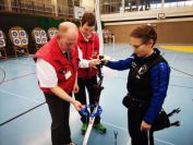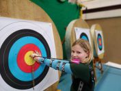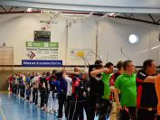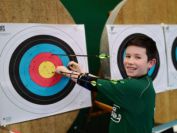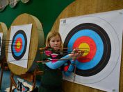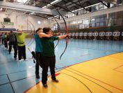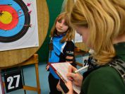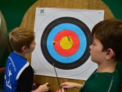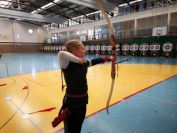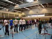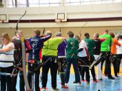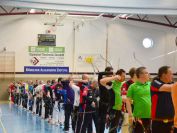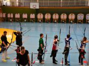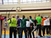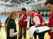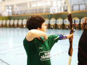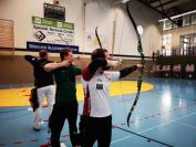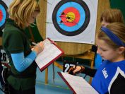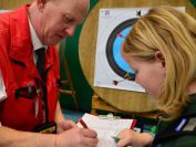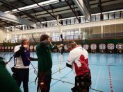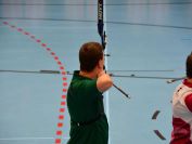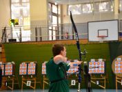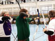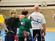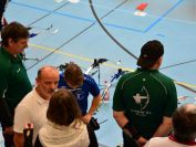 Gestärkt startete nun der zweite Wettkampf der Landesmeisterschaften. Nach der gemeinsamen Erwärmung aus Lockerungs- und Dehnübungen der Schützen mit dem Trainerteam, galt es sich der Bogenkontrolle zu unterziehen. Bevor jeder Schütze starten darf, wurde das Bogenequipment von einem Kamprichterkomitee entsprechend begutachtet: Pfeile sollten beschriftet sein, am Fingerschutz – Tab darf keine Markierung gekennzeichnet sein und selbst am Bogen darf der Zielpin beim Recurvebogen nicht über ein bestimmtes Maß herausragen. Beim traditionellen Bogen sind Hilfsmittel nicht erlaubt. Geschafft, der Bogen bekommt eine Marke und ist somit für den Wettkampf zugelassen. Nun konnten sich die Döbelner Bogenschützen voll und ganz auf den Wettkampf konzentrieren. „Jetzt schießt unser Nachwuchs, worauf wir sehr stolz sind. In der heimischen Gegend ist die Aufregung vielleicht nicht ganz so groß“, erzählt Vereinsvorsitzender Thomas Eichhorn. Konzentriert traten die Schützen an die Schießlinie, um auch wie die Vormittagsgruppe auf eine Distanz von 18 Metern auf ihre entsprechende Auflagengröße zu schießen.